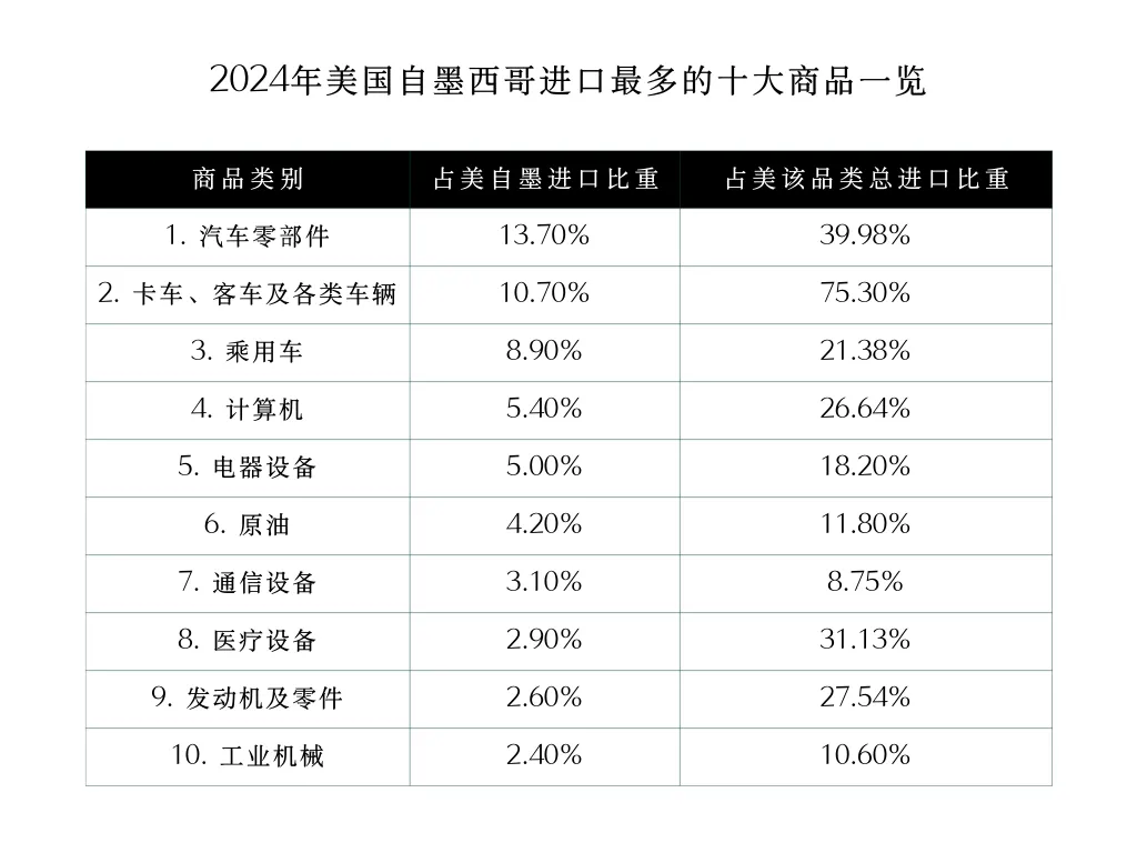 以下是2024年美国从墨西哥进口量最大的十类商品及占比: